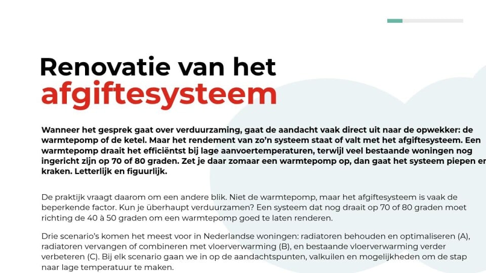 Drie scenario’s komen het meest voor in Nederlandse woningen: radiatoren behouden en optimaliseren (A), radiatoren vervangen of combineren met vloerverwarming (B), en bestaande vloerverwarming verder verbeteren (C). Bij elk scenario gaan we in op de aandachtspunten, valkuilen en mogelijkheden om de stap naar lage temperatuur te maken.